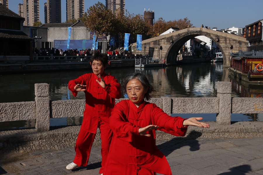 12月8日,古運河畔的清名橋歷史文化街區(qū),居民打太極拳。中國日報記者 姜東 攝