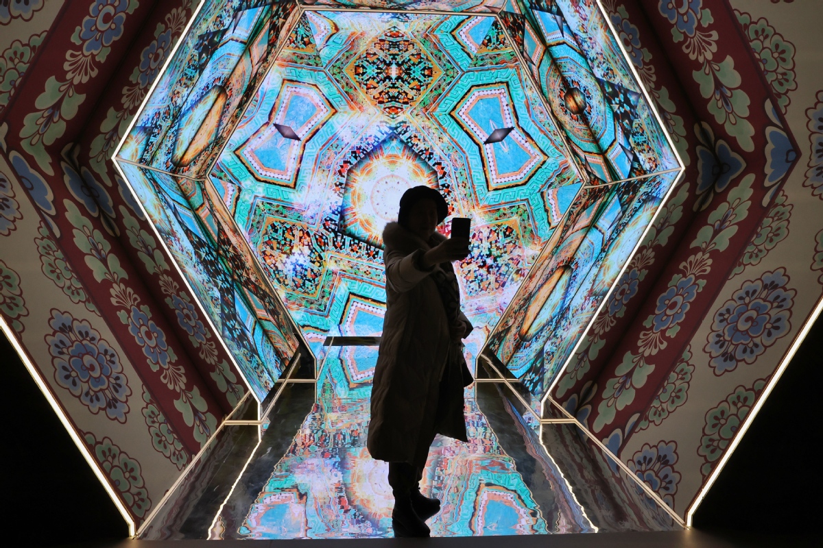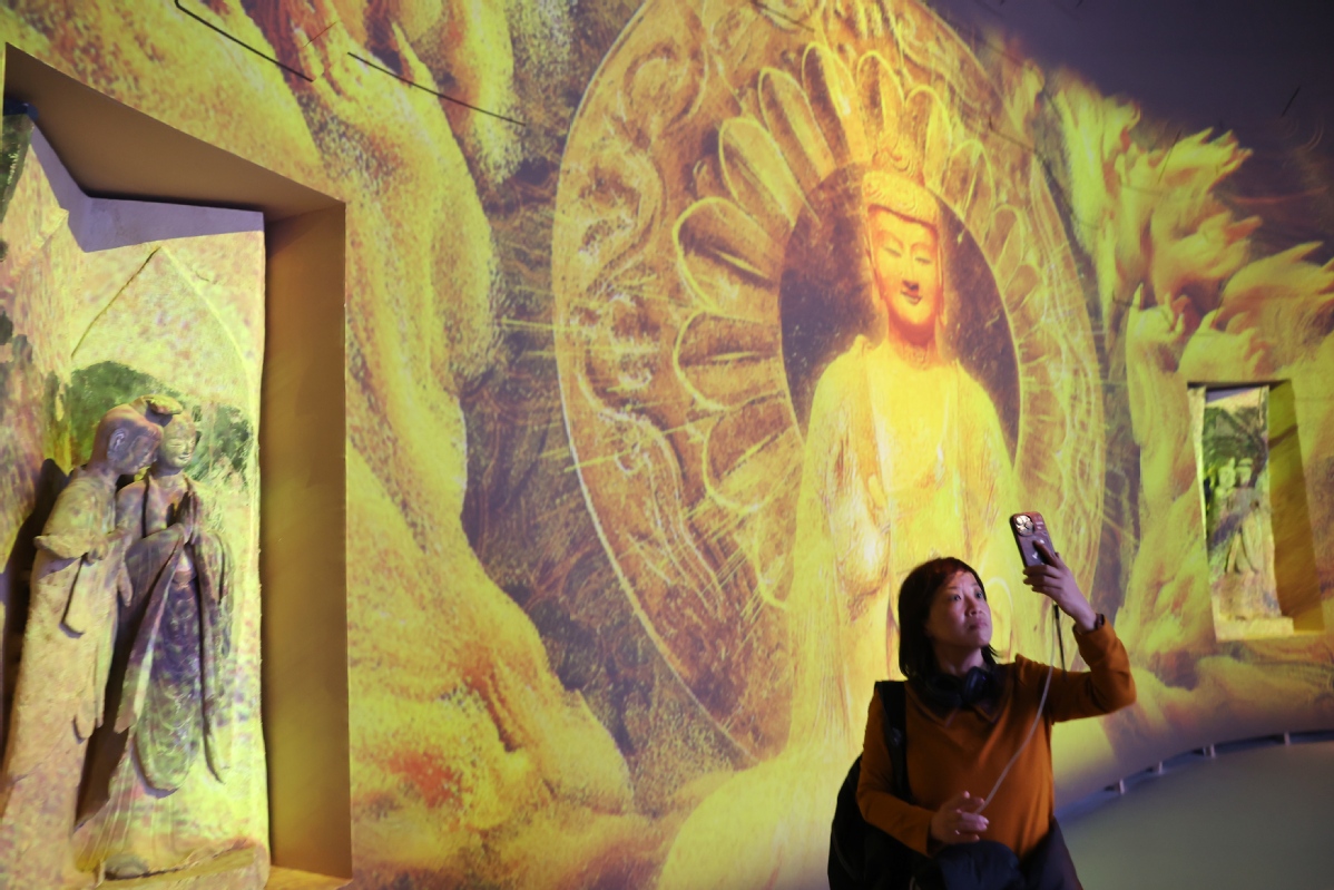 中國日報北京12月12日電(記者 姜東)2023年12月12日,北京,觀眾在中國國家博物館參觀“華彩萬象——石窟藝術(shù)沉浸體驗”。近日,“華彩萬象——石窟藝術(shù)沉浸體驗”在中國國家博物館對公眾開放。本次沉浸體驗展陳空間約1500平米,藝術(shù)家結(jié)合數(shù)字繪制、數(shù)字影像和AI算法技術(shù),以當(dāng)代眼光和獨特視角來表現(xiàn)、挖掘和闡釋克孜爾石窟、敦煌莫高窟、麥積山石窟、云岡石窟和龍門石窟的藝術(shù)風(fēng)格與豐富內(nèi)涵。