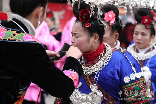 鼓藏節(jié)又叫“祭鼓節(jié)”,是苗族盛大的祭祖節(jié)日,13年過一次,不同苗寨過鼓藏節(jié)的輪回起始年份有所不同。鼓藏節(jié)的傳說多種多樣,其中一個傳說與姜央有關(guān)。傳說姜央遇到連續(xù)大旱,莊稼顆粒無收。于是求助于祭師,得知是自己兒子放牛時,牛踩踏了蝴蝶媽媽的墳塋,蝴蝶媽媽很生氣,要每年都?xì)⑴砑漓?。于是姜央殺牛祭祖,渡過了難關(guān)。后來姜央覺得如果每年都?xì)⑴<雷?,勢必影響農(nóng)業(yè)生產(chǎn),于是請求祭師禱告祖靈,以后十二生肖輪回再殺牛祭祖。從此,就有了13年過一次鼓藏節(jié)的習(xí)俗。