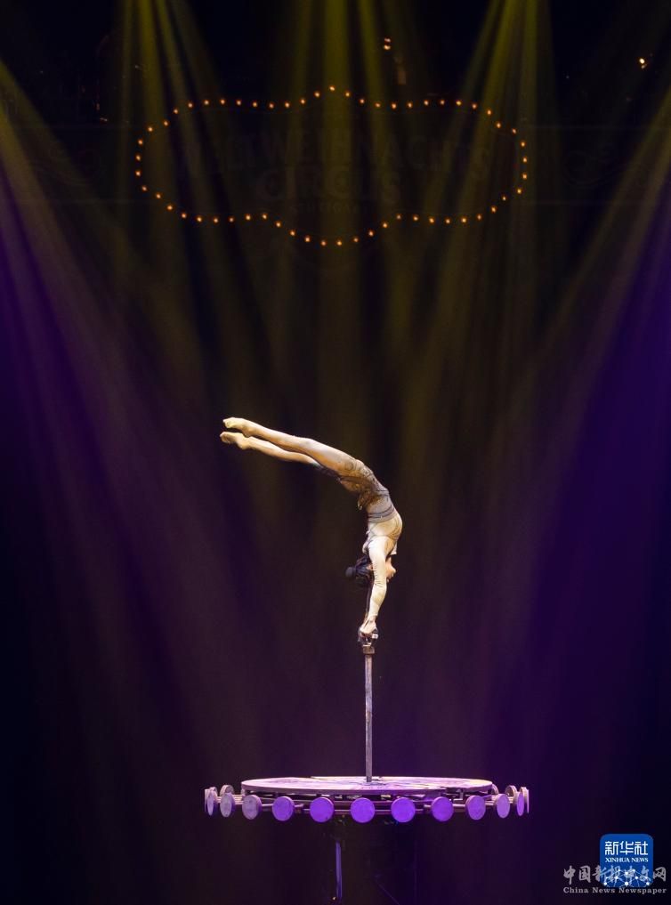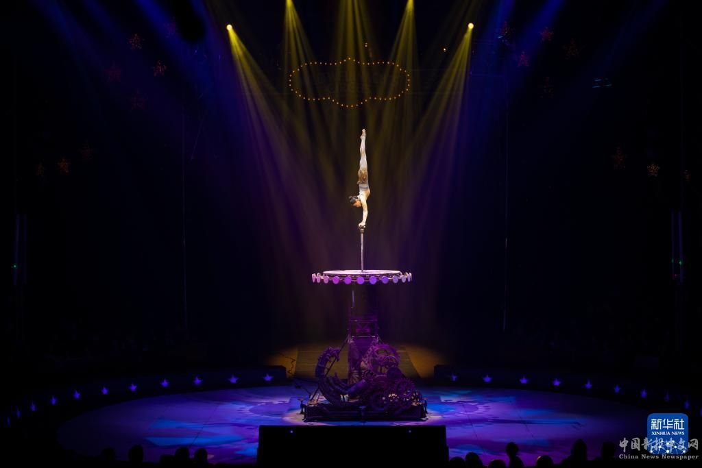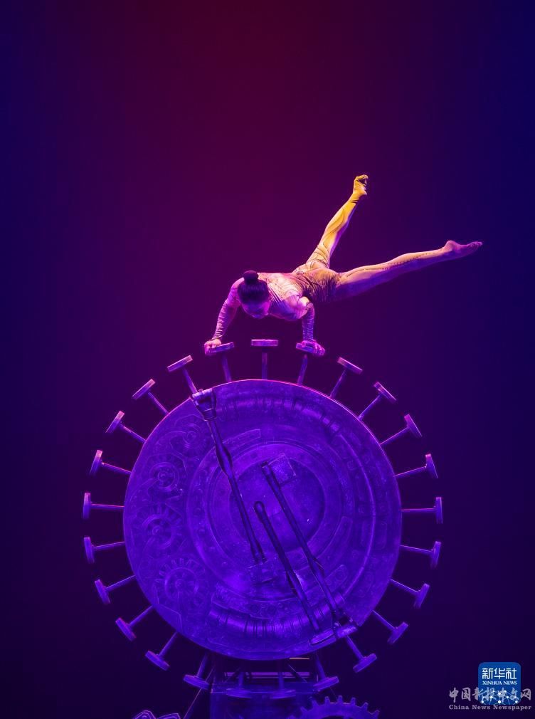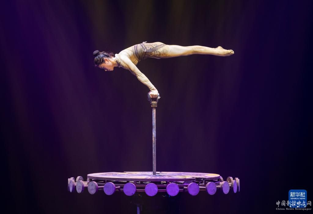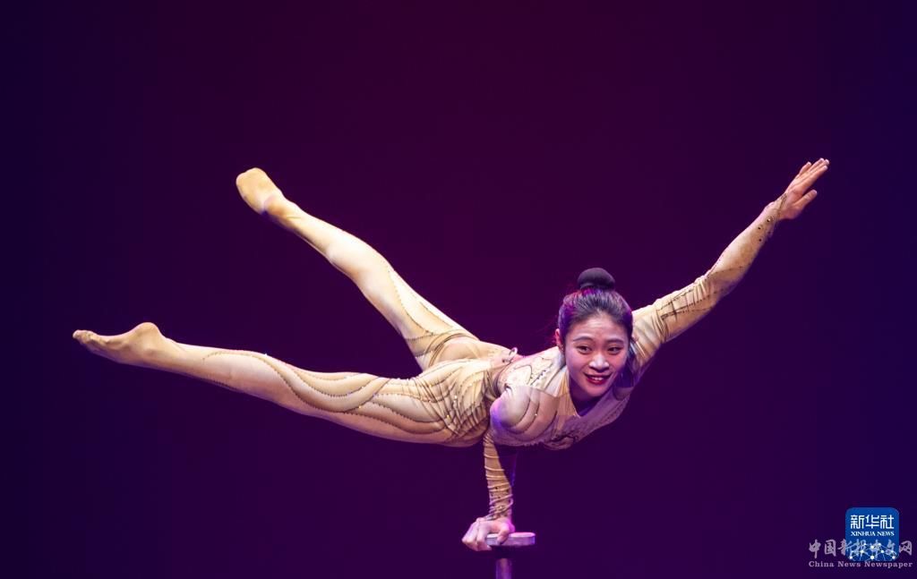 12月28日,江蘇省雜技團(tuán)演員王夢塵在德國斯圖加特表演雜技項(xiàng)目《煉——倒立技巧》。