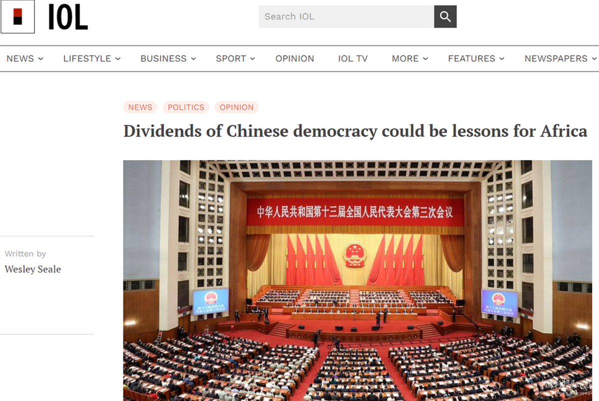 南非獨(dú)立在線新聞網(wǎng)站發(fā)表評(píng)論文章,稱贊中國(guó)“兩會(huì)”再次展示了一種不同的民主模式,這種治理模式給中國(guó)人民帶來(lái)了回報(bào),將推動(dòng)中國(guó)獲得更大的發(fā)展。