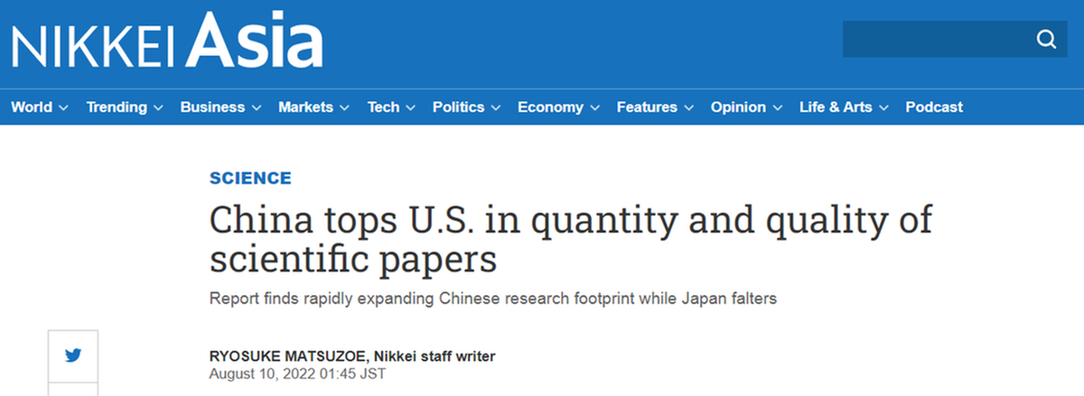《日本經(jīng)濟(jì)新聞》網(wǎng)站8月10日?qǐng)?bào)道稱,日本文部科學(xué)省科學(xué)技術(shù)和學(xué)術(shù)政策研究所發(fā)布的最新報(bào)告稱,中國(guó)科學(xué)論文量質(zhì)齊升,論文數(shù)量和質(zhì)量均已超過(guò)美國(guó)。研究人員引用次數(shù)進(jìn)入前1%的“頂尖論文”數(shù)量,論文總數(shù)和引用次數(shù)進(jìn)入前10%的“受關(guān)注論文”篇數(shù)三大關(guān)鍵指標(biāo),中國(guó)全部躍居全球首位。