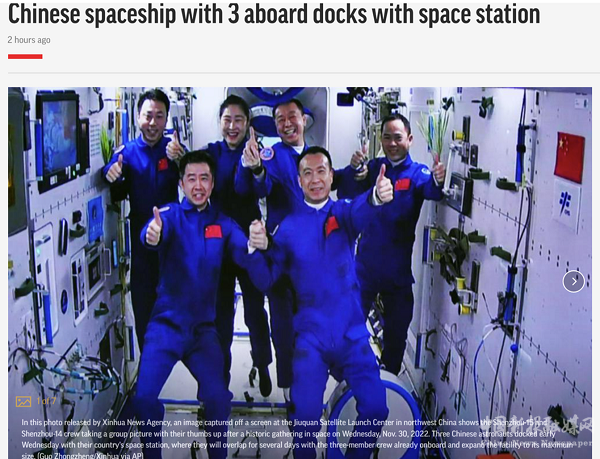 美聯(lián)社報(bào)道稱,三名中國(guó)航天員進(jìn)入中國(guó)空間站,他們將在天宮空間站與已有的三名航天員共同居住約一星期,實(shí)現(xiàn)中國(guó)史上首次航天員在軌輪換。