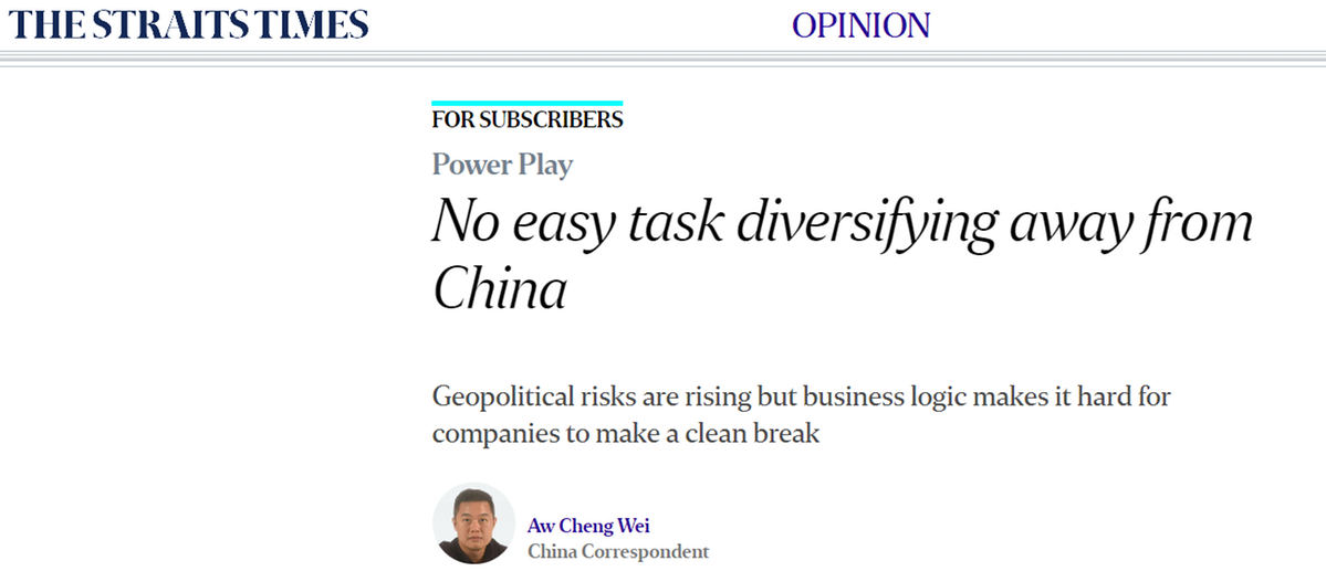 新加坡《海峽時(shí)報(bào)》評(píng)論稱,雖然受到地緣政治影響,在華外企面臨一些問(wèn)題,但是其他國(guó)家制造業(yè)生態(tài)系統(tǒng)并不成熟完善,脫離中國(guó)談何容易。