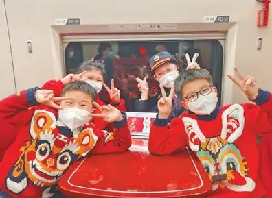 1月25日,G4052次列車工作人員與小旅客合影留念。丁 波攝(影像中國)