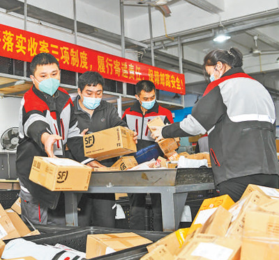 春節(jié)假期,順豐深圳南山科技園站點工作人員正在分揀快遞。新華社記者 梁 旭攝