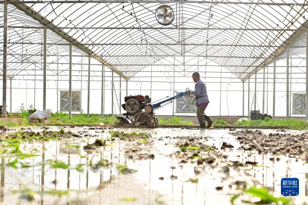 1月29日,在湖南省婁底市雙峰縣青樹坪鎮(zhèn)歸古新村,農(nóng)民駕駛農(nóng)機(jī)在大棚內(nèi)整地。新華社發(fā)(李建新 攝)