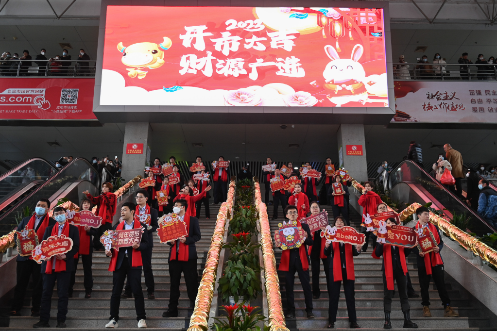 這是被稱為“世界超市”的義烏中國小商品城在中國疫情防控進(jìn)入新階段后的首個市場開市日。記者看到各區(qū)商戶貼春聯(lián)、掛花燈、上新品,面貌一新迎開市,而操著不同口音的采購商,往來于各家商戶,他們抱著同樣的想法——搶商機(jī)、談合作。