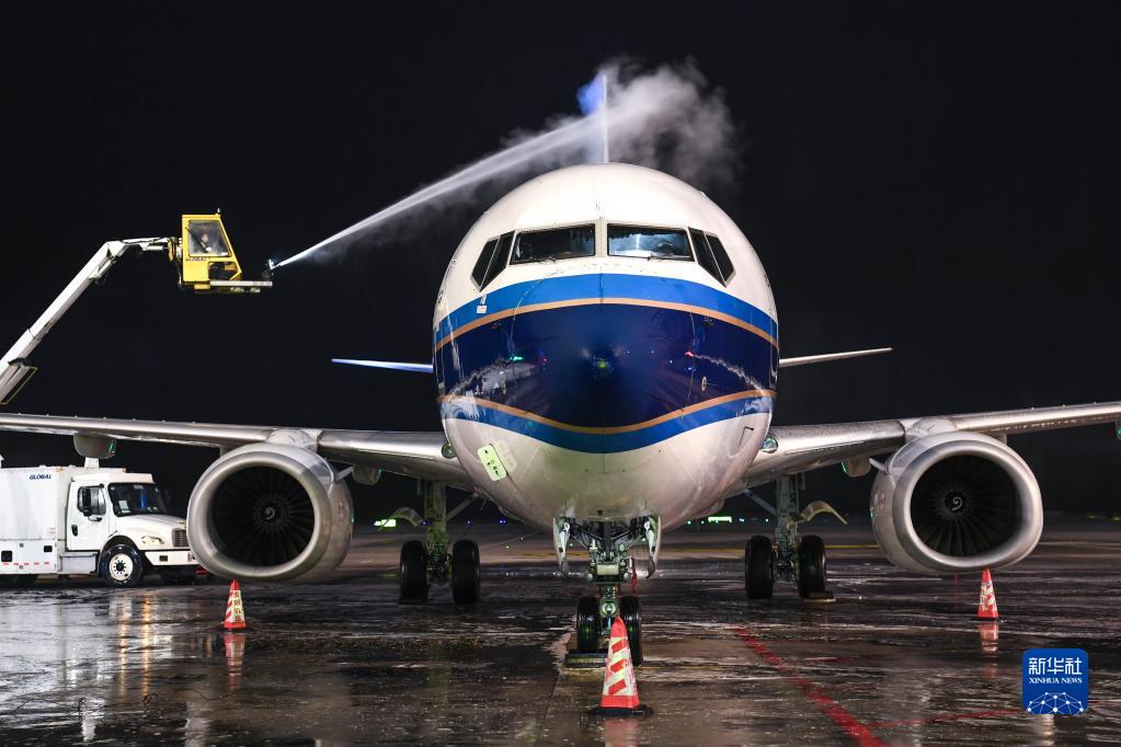 南方航空的機務(wù)人員在貴陽龍洞堡國際機場進行除防冰作業(yè)(1月17日攝)。新華社記者 楊文斌 攝