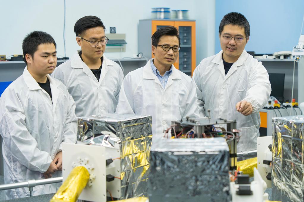 吳立剛(右二)日前和學(xué)生們在實驗室里交流討論。(受訪者供圖)