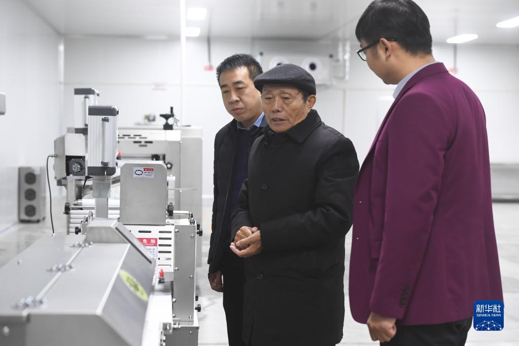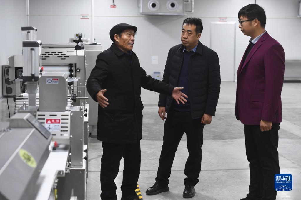 2月21日,在位于河南省濮陽市慶祖鎮(zhèn)西辛莊村的食品工業(yè)園,李連成(中)查看即將投產(chǎn)的饅頭生產(chǎn)線。新華社記者 張浩然 攝