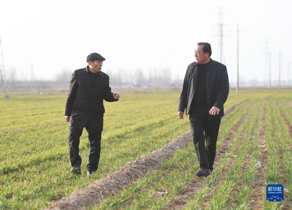 2月21日,在河南省濮陽市慶祖鎮(zhèn)的高標(biāo)準(zhǔn)農(nóng)田內(nèi),李連成(左)和種糧大戶交流。新華社記者 張浩然 攝