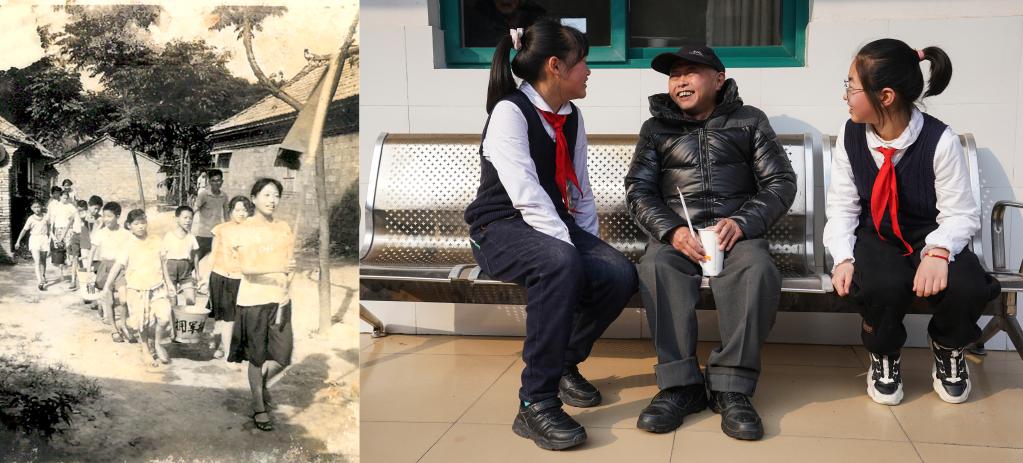 左圖:20世紀(jì)60年代,金沙小學(xué)五(2)雷鋒中隊(duì)隊(duì)員幫助軍烈屬打水(新華社發(fā));右圖:2023年2月24日,金沙小學(xué)學(xué)生們和當(dāng)?shù)鼐蠢显豪先肆奶欤ㄐ氯A社記者 季春鵬 攝)(拼版照片)。