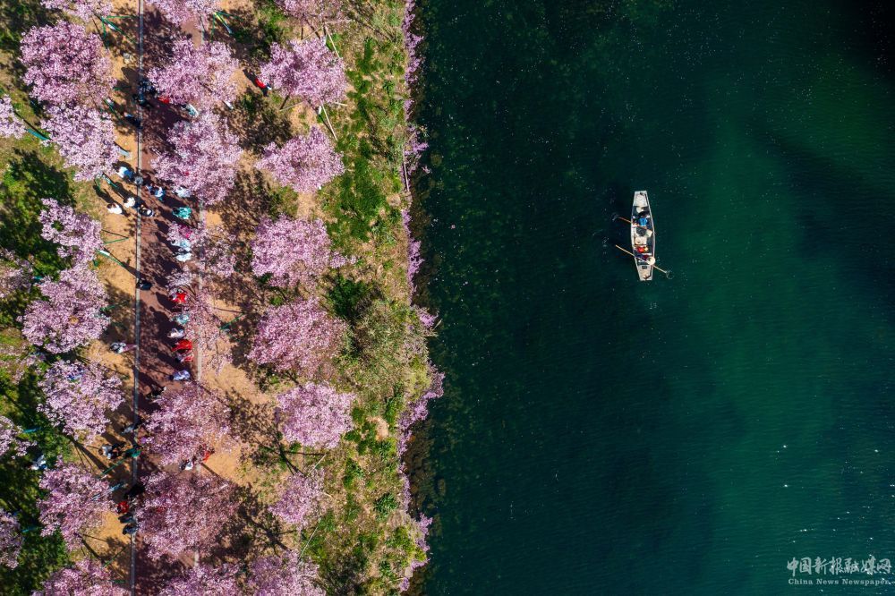 2023年3月14日,在浙江省金華市浦江縣浦陽(yáng)江同樂(lè)段,工作人員乘船在打撈水面漂浮物(無(wú)人機(jī)照片)。該江段通過(guò)生態(tài)治理、河湖清淤、景觀改造、種植水生植物等綜合整治措施,利用河道右岸的落羽杉林,在渠道上鋪設(shè)林蔭棧道,栽種1400余株櫻花形成1.5公里的櫻花大道,造就一片春有櫻花落英、秋有杉葉火紅的四季美麗風(fēng)景,滿足群眾賞景及親水需求。新華社記者 徐昱 攝
