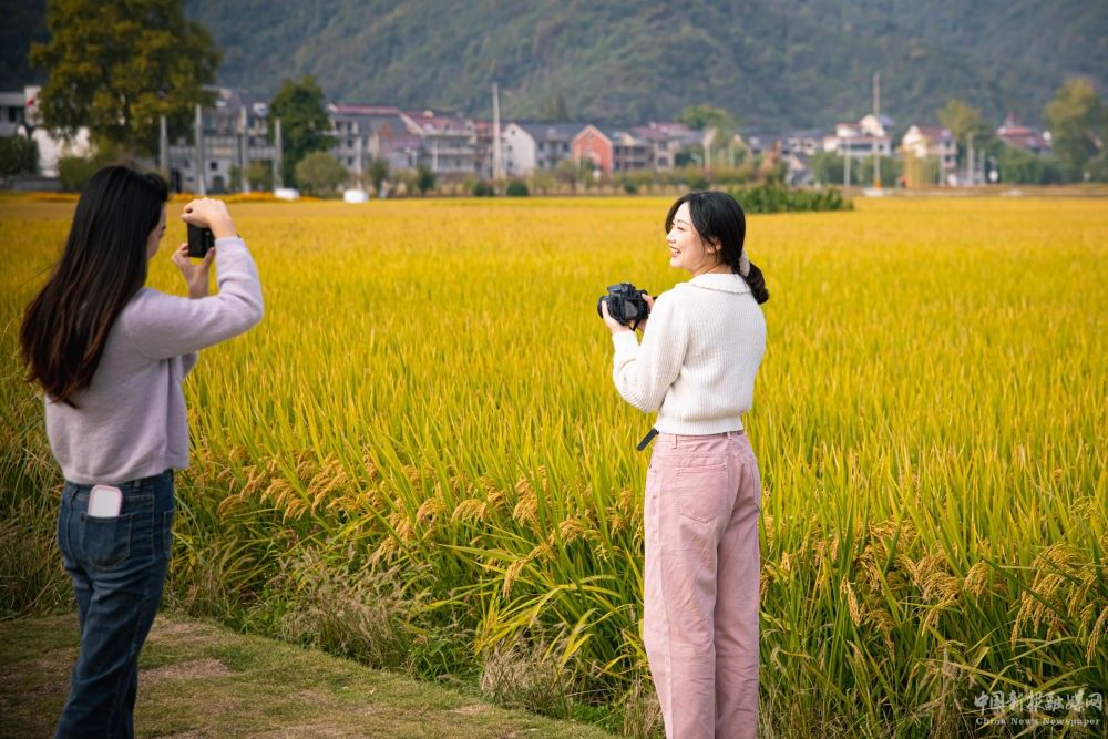 2022年10月25日,游客在浙江省桐廬縣桐君街道梅蓉村的稻田內(nèi)觀光。新華社記者 江漢 攝