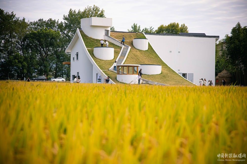這是2022年10月25日拍攝的浙江省桐廬縣桐君街道梅蓉村的稻田與鄉(xiāng)村會(huì)客廳。新華社記者 江漢 攝