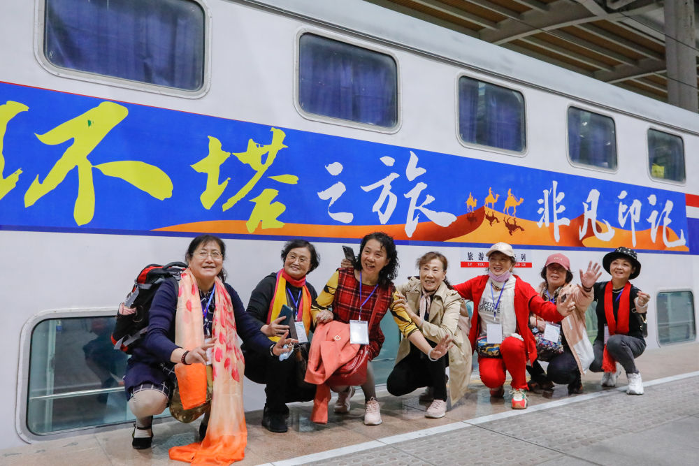 在新疆烏魯木齊站,游客在“環(huán)塔之旅·非凡印記”旅游專列前合影(3月27日攝)。新華社發(fā)(陳繼偉 攝)