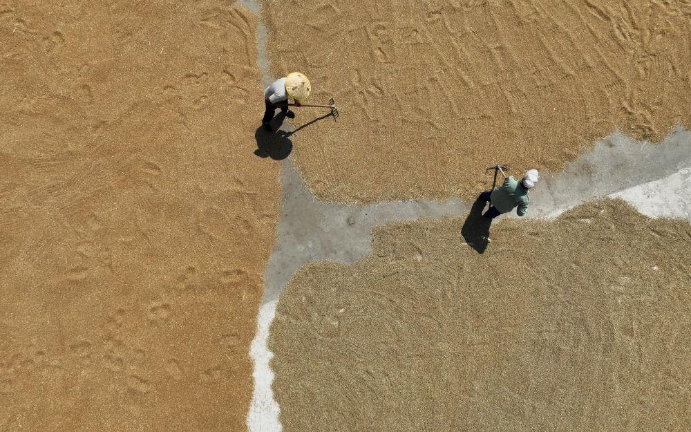 6月15日,在山東省淄博市農(nóng)邦邦糧食烘干收儲(chǔ)服務(wù)有限公司的曬場(chǎng)上,工人晾曬糧食。新華社記者 陳灝 攝