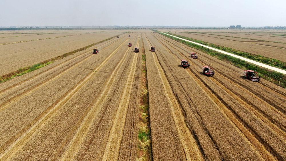 6月2日,在安徽省亳州市利辛縣胡集鎮(zhèn)張莊村明遠(yuǎn)種植專業(yè)合作社,農(nóng)機(jī)手駕駛收割機(jī)搶收小麥(無人機(jī)照片)。新華社發(fā)(劉勤利 攝)