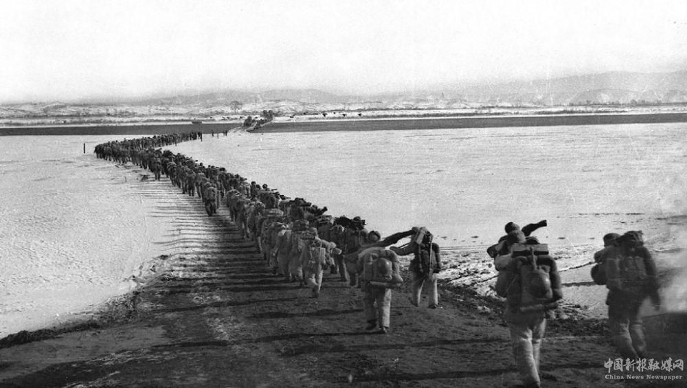 ↑1950年10月19日,中國(guó)人民志愿軍雄赳赳、氣昂昂跨過鴨綠江,和朝鮮人民一道共同抗擊侵略者。新華社發(fā)(黎民 攝)