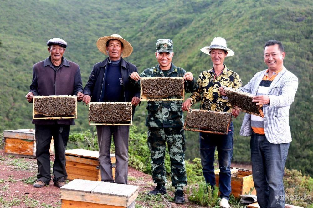 ↑武警四川總隊(duì)涼山支隊(duì)精準(zhǔn)幫扶昭覺縣梭梭拉打村發(fā)展養(yǎng)蜂產(chǎn)業(yè),總隊(duì)駐村扶貧干部布哈(中)和村民一同展示豐收成果(2019年6月12日攝)。新華社發(fā)(楊劍 攝)
