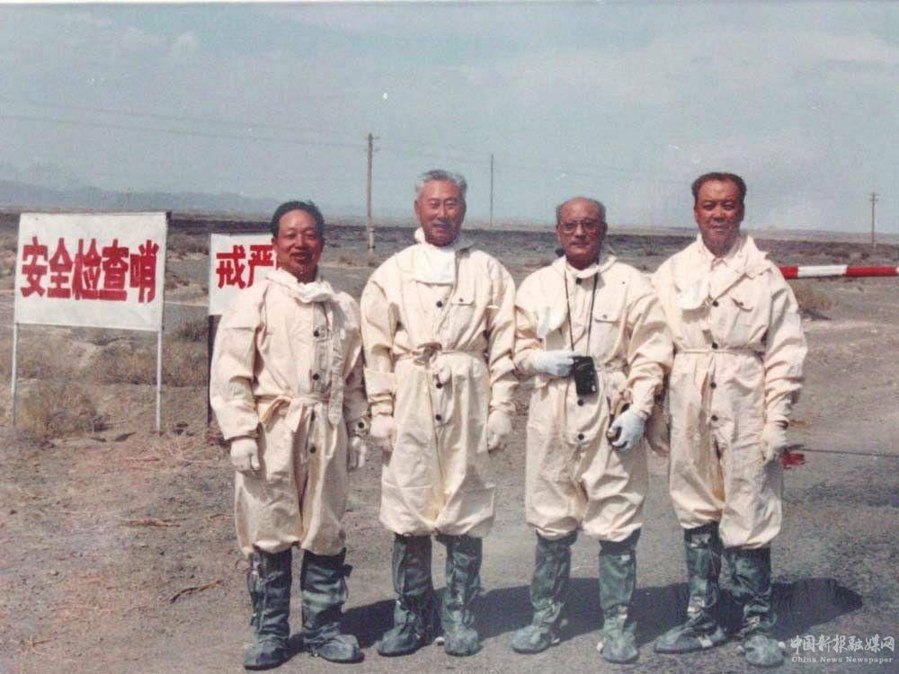 ↑一次核爆炸試驗(yàn)后,林俊德(左一)和參試人員從試驗(yàn)場(chǎng)區(qū)完成取樣任務(wù)后合影留念(資料照片)。新華社發(fā)