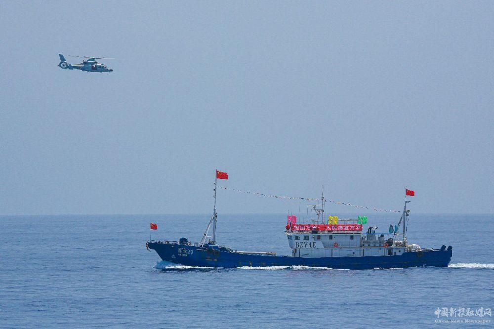 ↑中國(guó)海軍第40批護(hù)航編隊(duì)中的艦載直升機(jī)在被護(hù)船只周邊海域巡邏警戒(2022年6月4日攝)。新華社發(fā)(唐文 攝)