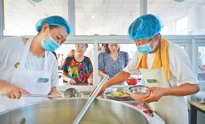 8月6日,河北省獻(xiàn)縣段村鎮(zhèn)段村中學(xué)安置點(diǎn),群眾在排隊取餐。本報記者 陳 斌攝