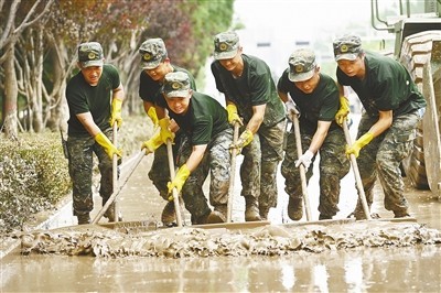 8月6日,河北省涿州高新區(qū)騰飛大街范陽路至朝陽路段,武警河北總隊機(jī)動支隊官兵在清理道路淤泥。本報記者 雷 聲攝