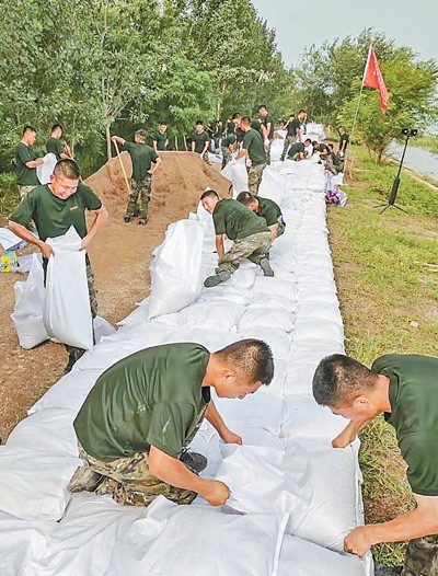 日前,天津市靜海區(qū)臺頭鎮(zhèn)大清河南岸,武警天津總隊官兵在加固堤壩。武警天津總隊供圖