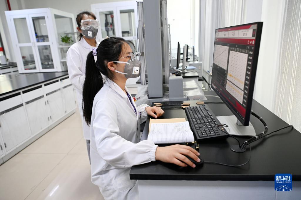 在中國(guó)建材集團(tuán)西寧萬噸碳纖維生產(chǎn)基地實(shí)驗(yàn)室內(nèi),工作人員對(duì)碳纖維拉力進(jìn)行測(cè)試(8月27日攝)。