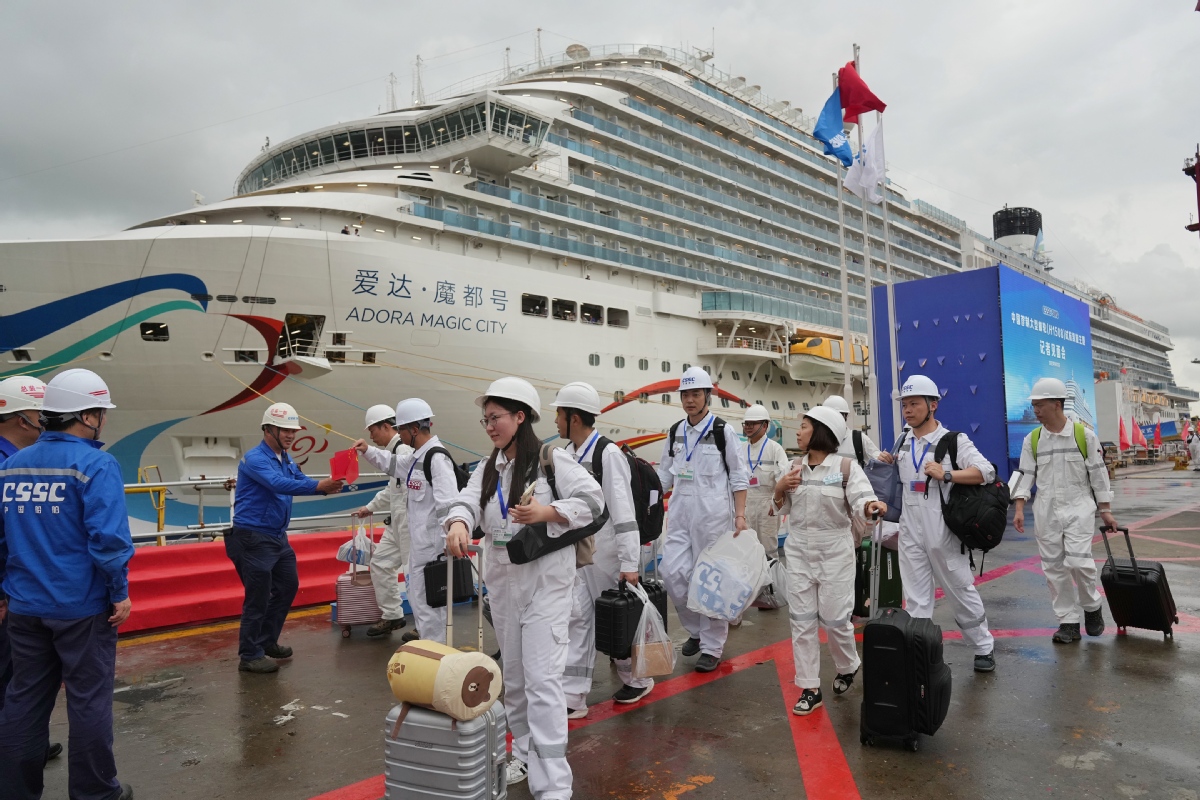 9月12日,參與試航的人員從首艘國產(chǎn)大型郵輪“愛達·魔都號”走下。中國日報記者 高爾強 攝