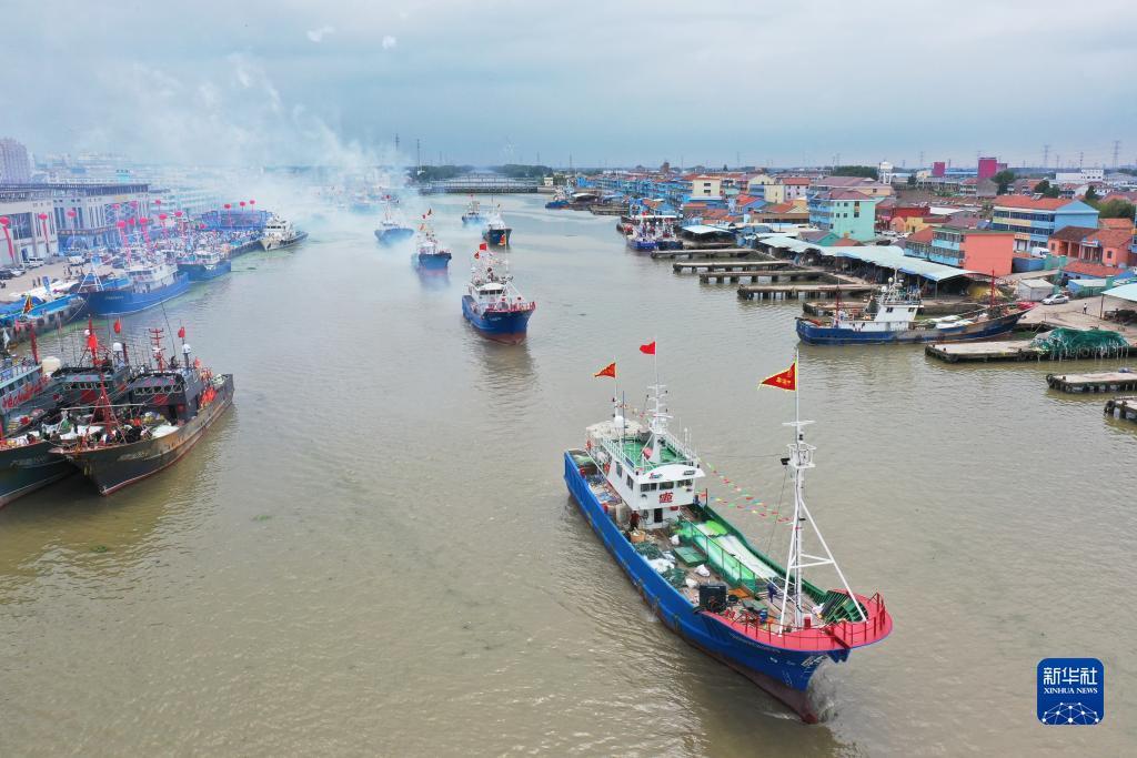 9月16日,在江蘇省鹽城市射陽(yáng)縣黃沙港國(guó)家中心漁港,漁船開漁出海(無(wú)人機(jī)照片)。