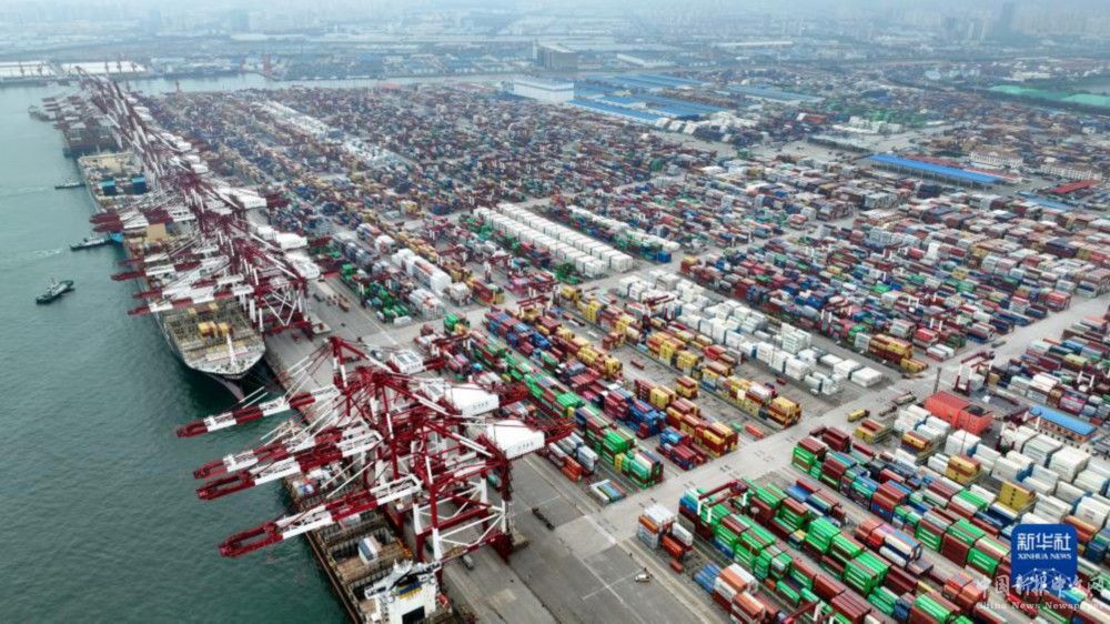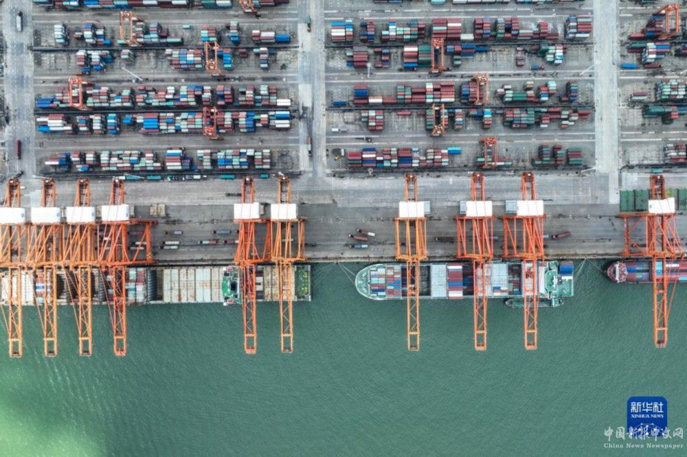 這是2022年7月29日拍攝的繁忙的山東港口青島港前灣集裝箱碼頭(無(wú)人機(jī)照片)。新華社記者 李紫恒 攝