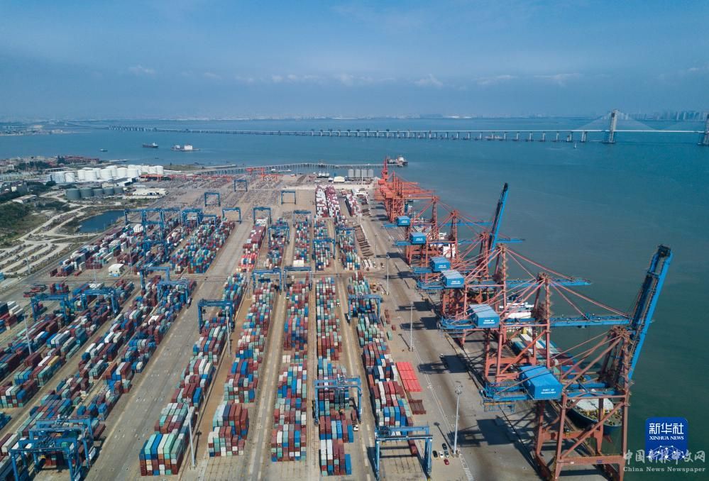 在泉州最主要的現(xiàn)代集裝箱港石獅石湖港,大型機(jī)械在吊裝集裝箱(2020年7月15日攝)。新華社記者 宋為偉 攝