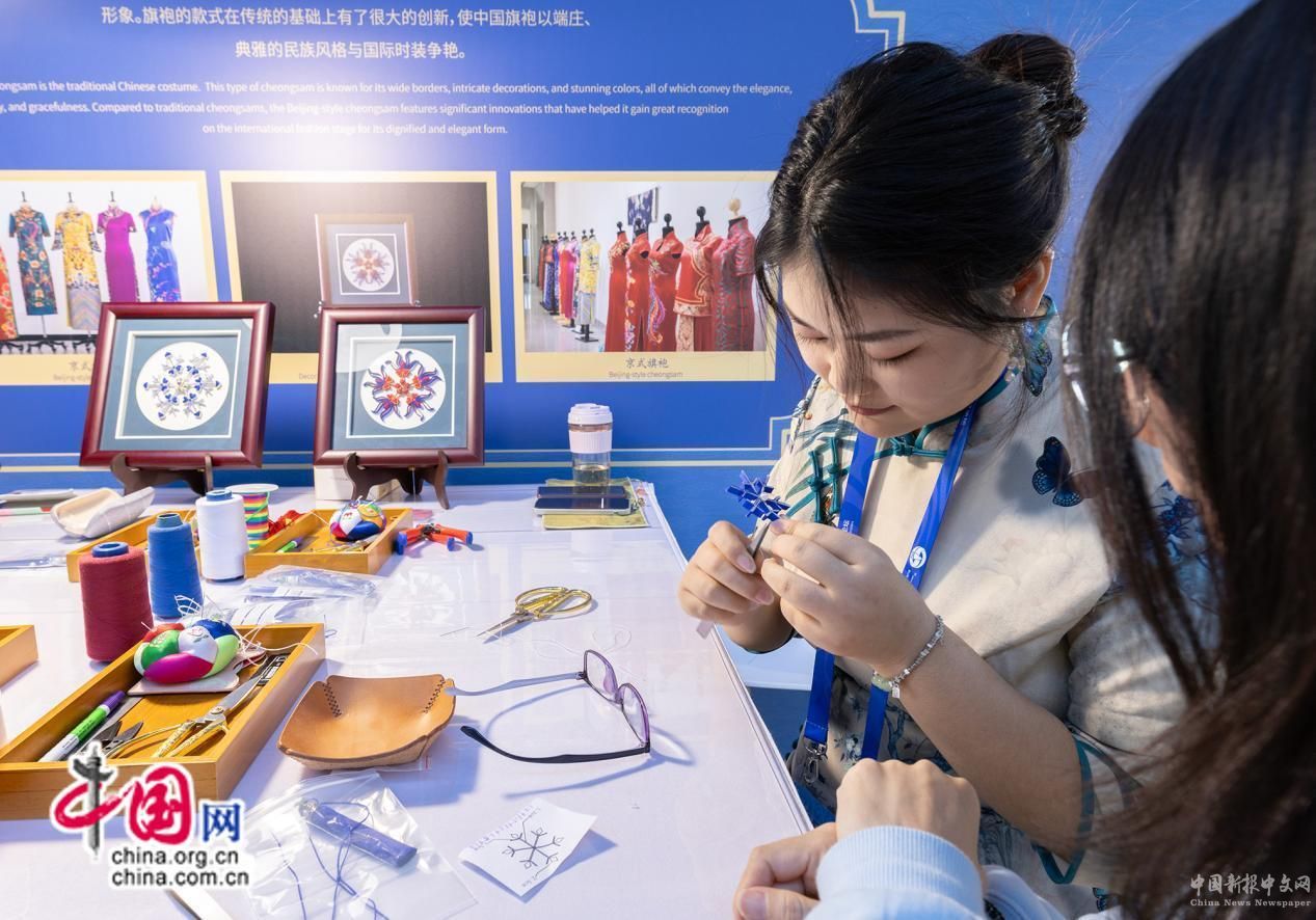 體驗(yàn)京式旗袍傳統(tǒng)制作技藝。中外嘉賓在非遺互動(dòng)體驗(yàn)區(qū),可以通過(guò)現(xiàn)場(chǎng)講解、教學(xué)互動(dòng)等方式,體驗(yàn)中華民族非遺的魅力。中國(guó)網(wǎng) 楊佳 攝影