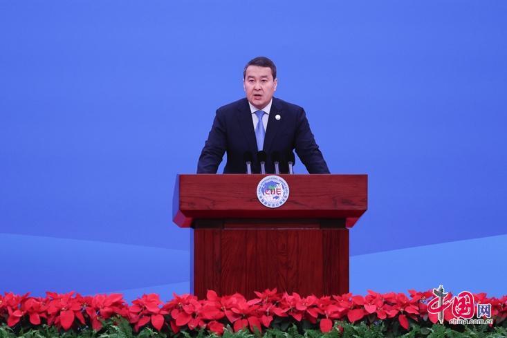11月5日,第六屆中國國際進口博覽會暨虹橋國際經(jīng)濟論壇在上海市開幕,圖為哈薩克斯坦總理斯邁洛夫致辭。中國網(wǎng)記者 董寧 攝影