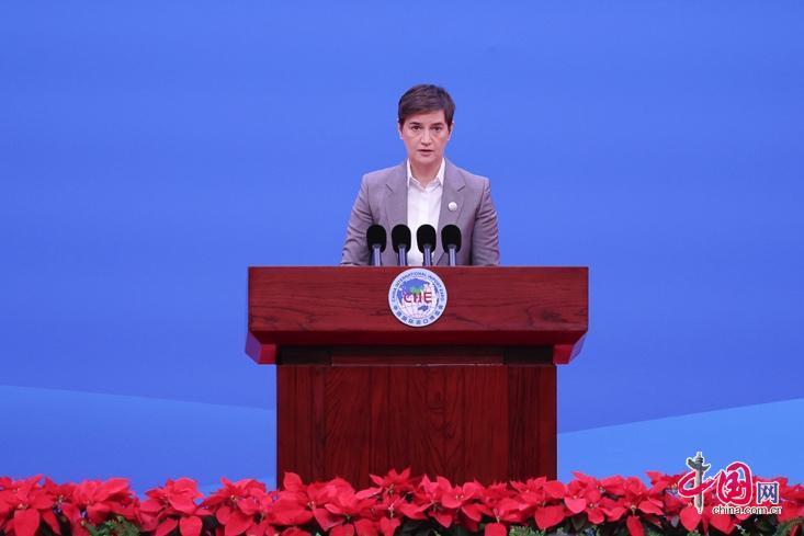 11月5日,第六屆中國國際進口博覽會暨虹橋國際經(jīng)濟論壇在上海市開幕,圖為塞爾維亞總理布爾納比奇致辭。中國網(wǎng)記者 董寧 攝影