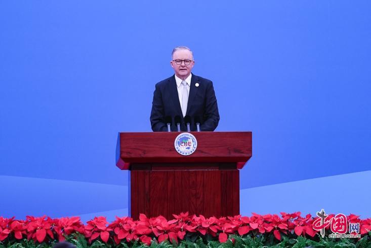 11月5日,第六屆中國國際進口博覽會暨虹橋國際經(jīng)濟論壇在上海市開幕,圖為澳大利亞總理阿爾巴尼斯致辭。中國網(wǎng)記者 董寧 攝影