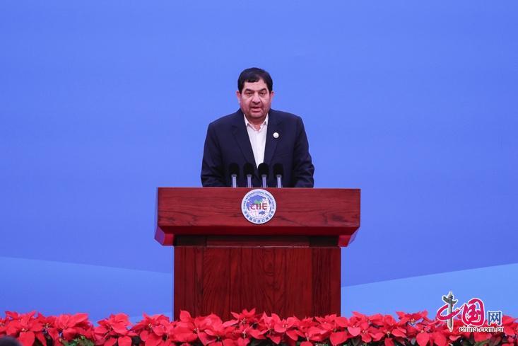 11月5日,第六屆中國國際進口博覽會暨虹橋國際經(jīng)濟論壇在上海市開幕。圖為伊朗第一副總統(tǒng)穆赫貝爾致辭。中國網(wǎng)記者 董寧 攝影