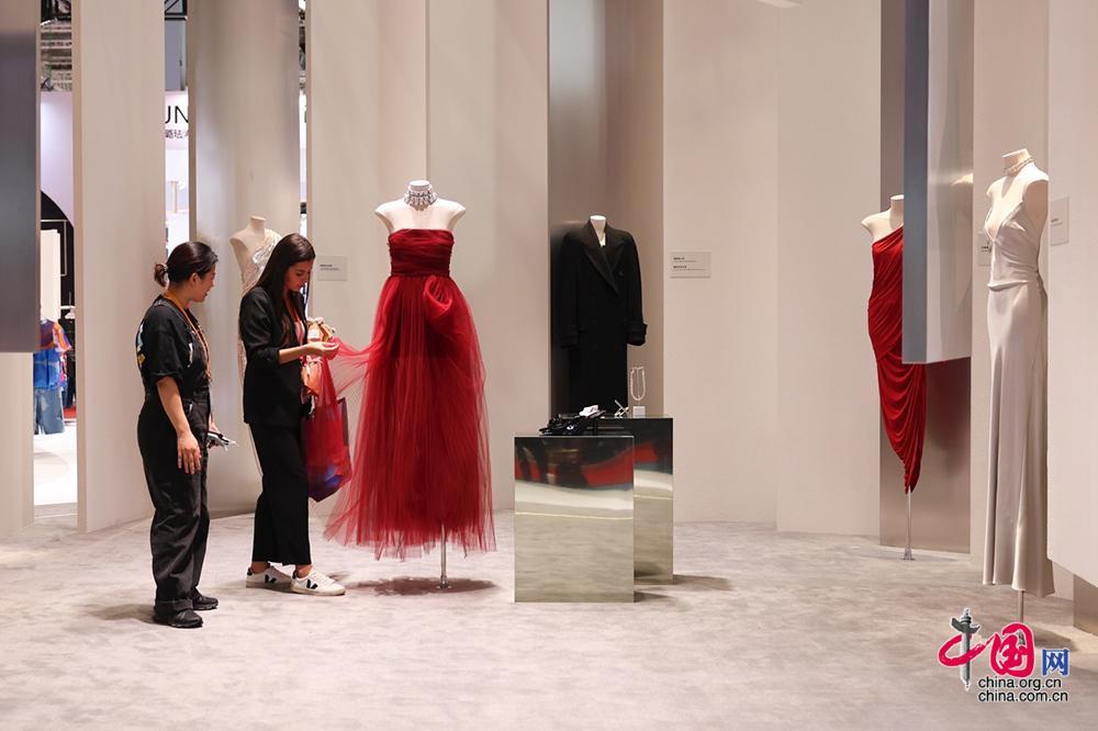 11月5日,觀眾在H&M展臺觀看由廢棄物再利用制作的紗裙。中國網(wǎng)記者 董寧 攝影