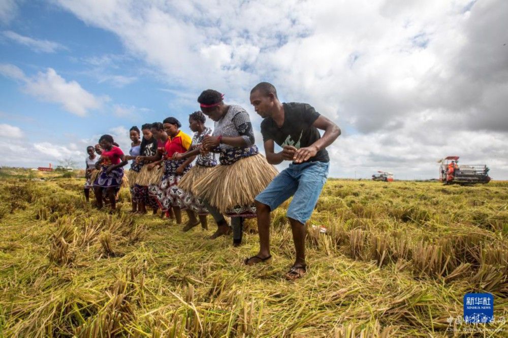 在莫桑比克萬寶莫桑農(nóng)業(yè)園,農(nóng)戶在水稻收割現(xiàn)場載歌載舞慶祝豐收(2019年4月7日攝)。萬寶莫桑農(nóng)業(yè)園是中國在非洲最大規(guī)模水稻種植項目,極大地緩解了莫桑比克糧食短缺問題。新華社記者 張宇 攝