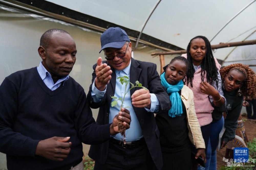 在肯尼亞納庫魯郡舉辦的中非農(nóng)業(yè)發(fā)展和減貧示范村番茄生產(chǎn)培訓(xùn)班上,來自中國的農(nóng)學(xué)教授劉高瓊(左二)為肯方學(xué)員指導(dǎo)農(nóng)業(yè)技術(shù)(2023年9月18日攝)??夏醽喖{庫魯郡的馬坦吉提薩村是“‘一帶一路’南南合作農(nóng)業(yè)教育科技創(chuàng)新聯(lián)盟”在非洲建設(shè)的首批示范村之一。多年來,中國農(nóng)業(yè)專家在當(dāng)?shù)亻_展了知識培訓(xùn)、技術(shù)指導(dǎo)和農(nóng)業(yè)設(shè)施修繕等工作,有效助力中國先進的農(nóng)業(yè)技術(shù)在納庫魯?shù)貐^(qū)的示范推廣,幫助農(nóng)民實現(xiàn)增收減貧的目標。新華社記者 韓旭 攝