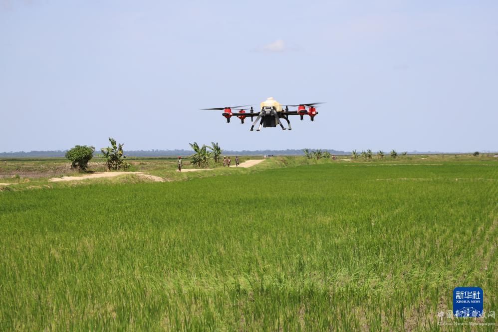 在烏干達卡隆古區(qū)盧卡亞鎮(zhèn)中億農(nóng)業(yè)園,一架植保無人機進行噴灑農(nóng)藥作業(yè)(2021年6月2日攝)。2014年以來,烏干達卡隆古區(qū)盧卡亞鎮(zhèn)的灘涂在中國企業(yè)的開發(fā)下已經(jīng)變成萬頃良田,并建起了現(xiàn)代化農(nóng)場。新華社記者 張改萍 攝