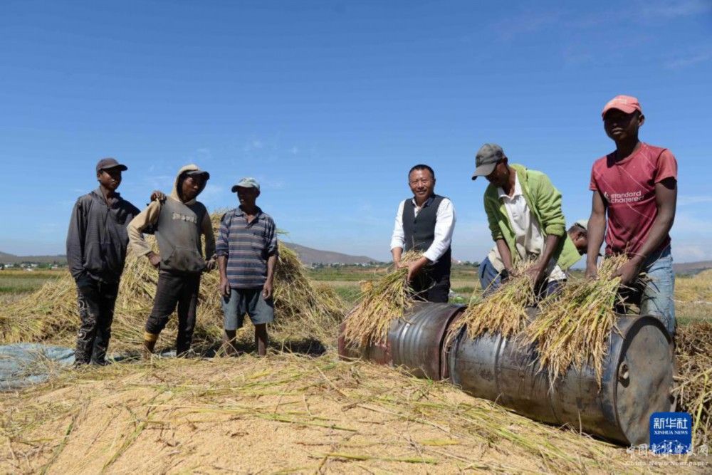 在馬達加斯加首都塔那那利佛附近的馬義奇鎮(zhèn),中國雜交水稻技術(shù)專家胡月舫(右三)在中國國家雜交水稻工程技術(shù)研究中心非洲分中心的試驗田里和當(dāng)?shù)剞r(nóng)民一起收獲水稻(2023年5月12日攝)。自2007年開始,馬達加斯加與中國展開雜交水稻技術(shù)合作。馬達加斯加距離實現(xiàn)糧食自給自足的目標邁近了一大步。新華社發(fā)(西塔卡·拉喬納里松攝)