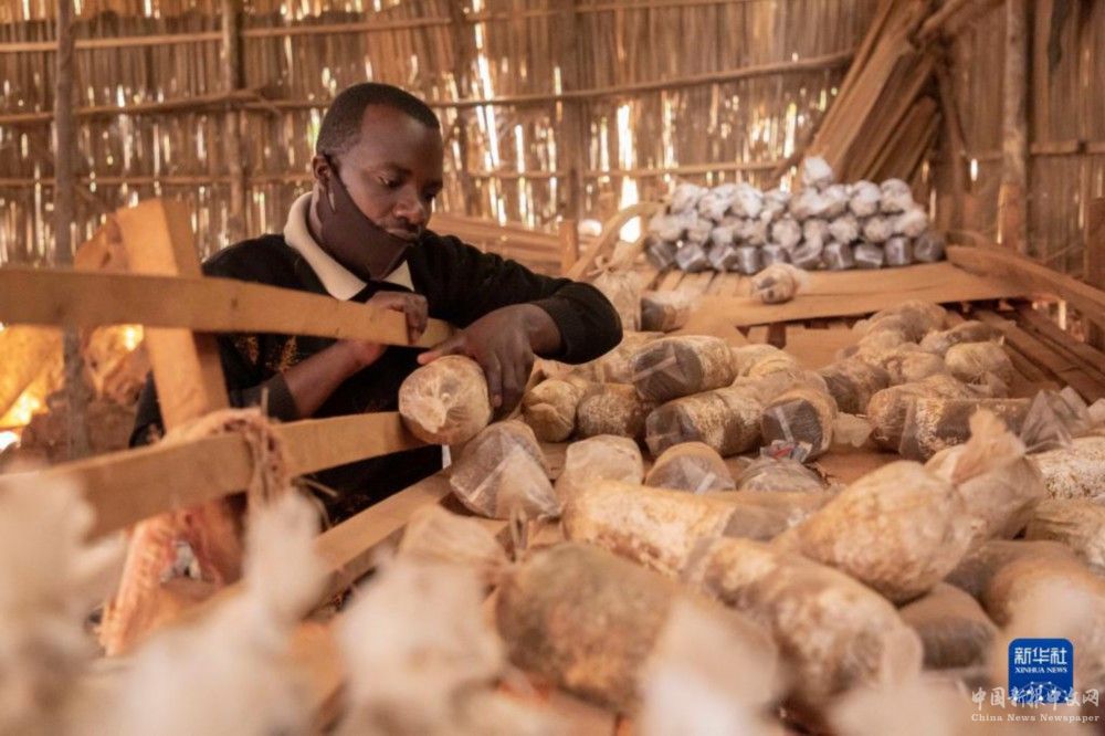 在盧旺達首都基加利的一家食用菌培育作坊,作坊主人埃馬紐埃爾·阿希馬納檢查菌袋(2020年9月9日)。中國福建農(nóng)林大學(xué)的菌草專家2006年來到盧旺達開始菌草技術(shù)合作項目,在當(dāng)?shù)厥痉逗屯茝V菌草技術(shù)。新華社發(fā)(西里爾·恩德格亞攝)