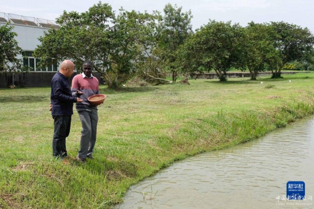 在烏干達首都坎帕拉市郊的烏干達水產(chǎn)研究與發(fā)展中心,一名當(dāng)?shù)貑T工在池塘邊與來自中國的水產(chǎn)專家陳太華交流(2022年12月21日攝)。烏干達水產(chǎn)研究與發(fā)展中心是中國-聯(lián)合國糧農(nóng)組織-烏干達(三期)南南合作項目水產(chǎn)示范基地,這里的漁場排灌系統(tǒng)采用中國技術(shù)建設(shè)而成。(阿佳拉·納瓦達攝)