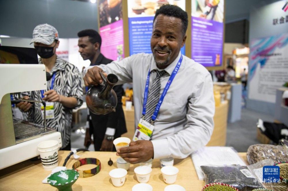 在長沙舉行的第三屆中國-非洲經(jīng)貿(mào)博覽會上,參展商阿爾弗萊德·安托尼介紹埃塞俄比亞咖啡(2023年6月29日攝)。隨著中國開放的大門越開越大、中國咖啡消費的快速增長,埃塞俄比亞咖啡在中國越來越受歡迎。新華社記者 孫瑞博 攝