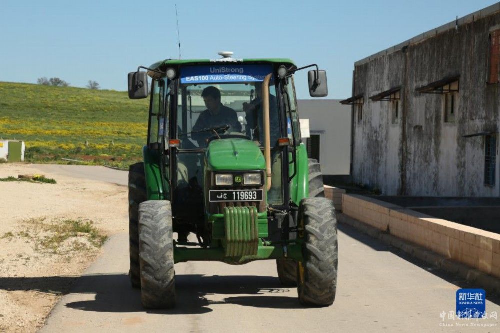 這是在突尼斯邁賈茲巴卜高等農(nóng)業(yè)工程學(xué)校拍攝的一輛農(nóng)用拖拉機。中國工程師給這輛拖拉機安裝了使用北斗衛(wèi)星導(dǎo)航系統(tǒng)的自動駕駛設(shè)備(2019年3月10日攝)。