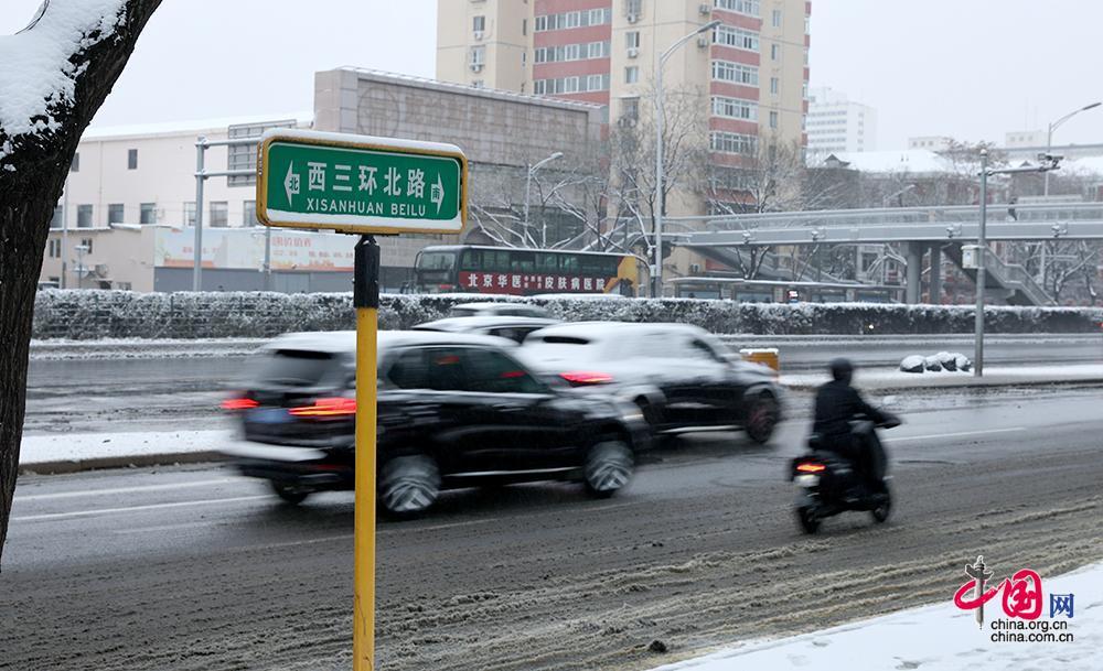 12月10日夜間開始,北京各地天空陸續(xù)飄雪,北京今冬首場降雪緩緩落下。預計11日白天,北京仍有小雪或零星小雪天氣,最高氣溫1℃左右,體感寒冷。圖為12月11日,北京西三環(huán)北路車輛在道路上行駛。中國網(wǎng)記者 劉楨珂攝影